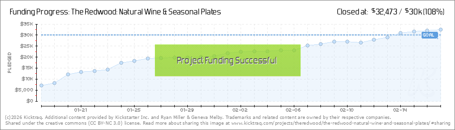 Thank you, thank you, THANK YOU!!!!!! We are truly in awe of all of the support we received toward chasing our dream. Opening day is getting really close and we cannot wait to welcome you into The Redwood and begin repaying your generosity. For... (Read More)