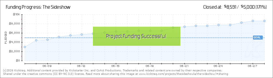 You have all been AMAZING! This community has showed us a tremendous amount of support, as we end our first day 64% closer to funding The Sideshow. Glad to see you all are just as excited about the experience as we are. But we're not finished... (Read More)