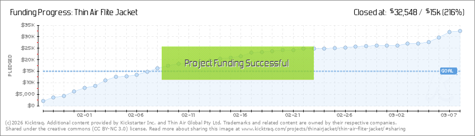 Hi to all of our wonderfull backers and followers of the Thin Air Flite Jacket Kickstarter campaign! Excellent news! We’re excited to announce that we have achieved our funding goal!!! Thank you for helping us make this a reality! We are very... (Read More)