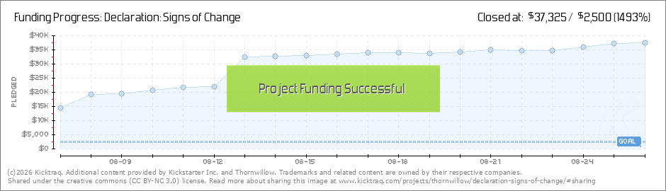 Dear Backer, I am thrilled to report that we are off to a Great Start with our Declaration: Signs of Change campaign. Thank you so much for participating and giving this project such a great lift off. As part of our DECLARATION: Signs of Change... (Read More)