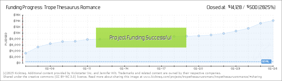 Dear Trope Thesaurus Romance (TTR) Backers, You Guys, I'm so thrilled with your support for my project! Thank you! We are now funded and we even got A Projects We Love shout-out from Kickstarter I've put so much of myself into TTR, which sounds... (Read More)