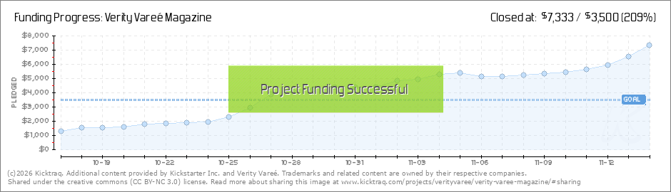Everyone, The funding for Verity Vareé Magazine has surpassed it's goal in 10 days! With 17 days left, reaching $6,500 is a real possibility. It is a stretch, but that's why they call it a stretch goal! If we make this stretch goal we can commit... (Read More)