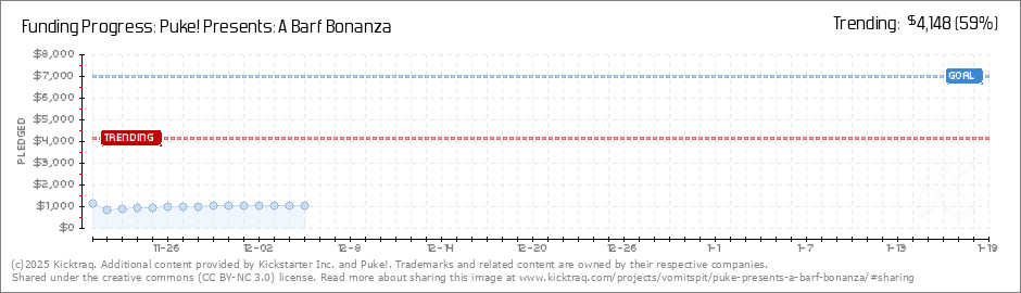 Help your backers reach your daily goals and help others see how you're doing. It's easy, with Kicktraq Mini.Here are a few quick snippits of code you can use to embed your personalized widget on your website, in your blog, and even on your favorite forum.