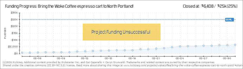 Hey Everyone! We got the coffee cart!! our baby! We know what you're thinking: "I'm confused - you're only 22% funded with 5 days to go?" Yep. Here's the thing: We're super serious about this. So we found a way to get a small loan for the purchase... (Read More)