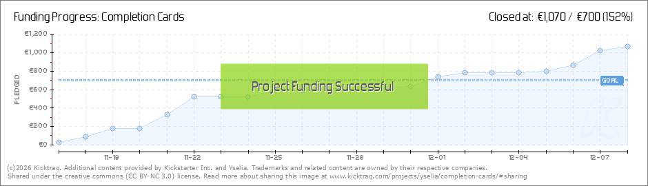 Hi !With 6 days still left to go, the Kickstarter is now fully funded ! Which means I will be able to buy the new cutting machine and maybe even a new printer, and work hard to create you the Completion Cards you bought ! Thank you very much to... (Read More)