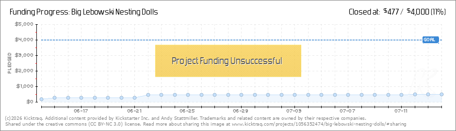 Thank you to everyone who backed the Big Lebowski Nesting Doll project. Unfortunately, I didn't reach the $4000 goal. You will not be charged for the Rewards that you backed. Hopefully the next time I'll be successful. It was a good learning... (Read More)
