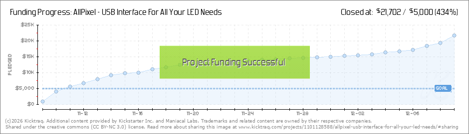 Thank you so much to all of our wonderful backers! We've hit that first stretch goal, so the AllPixel will be getting support for four new LED driver chipsets. Updated firmware code will be up on GitHub as soon as we've had some more time to test.... (Read More)