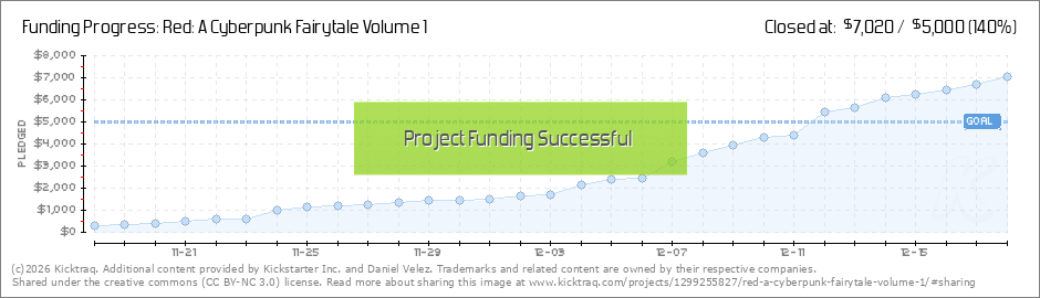 Hi, everyone! Wow! The Kickstarter campaign for Red: A Cyberpunk Fairytale has surpassed the $5000 goal, and will be funded on Dec. 18 at 10:00 AM. Thank you to everyone for their pledges, encouragement, and for getting the word out!! Words cannot... (Read More)