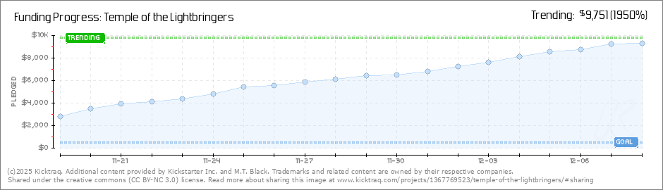 Help your backers reach your daily goals and help others see how you're doing. It's easy, with Kicktraq Mini.Here are a few quick snippits of code you can use to embed your personalized widget on your website, in your blog, and even on your favorite forum.