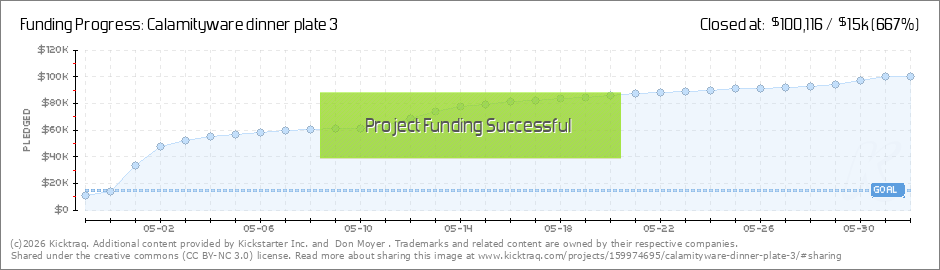 Calamityware now has a Facebook page. If you visit the page and "like" it, you’ll be assured of getting updates about creating, producing, and using Calamityware plates and related topics. This Kickstarter project closes at midnight EDT on... (Read More)