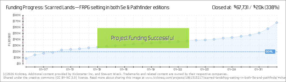 It took less than 100 hours! FUNDED! Thanks again to everyone for your amazing support. Here's a word from my Scarred Lands partner, Rich Thomas: From RichT of Onyx Path"Yeah! We are funded! Thanks so much to everyone who pledged to get us here!... (Read More)