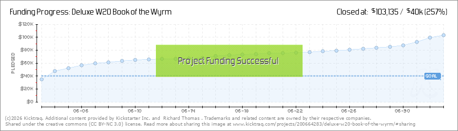 In no time at all, you folks have passed the Wyrm KS Shirt Stretch Goal, and will now be given the chance to get a limited edition, discounted, Deluxe W20 Book of the Wyrm Kickstarter shirt from our RedBubble store once this whole thing is funded in... (Read More)