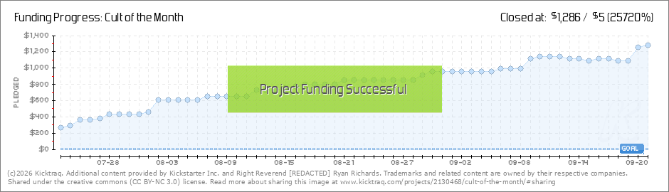 We Are Barely 7668% Funded With Only 55 days to go! First of all, THANK YOU. Your support is loved and appreciated! You will be remembered as being the first ones to get in on "Cult of the Month". If this was Amway you'd be so set. But it's not, but... (Read More)
