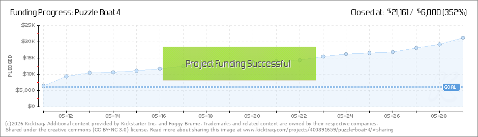 We now have Stretch Goals! At $15,000, Puzzle Boat 4 will get a thematic epilogue in the form of additonal puzzles and an additional meta. At $20,000, all backers at $10 will get a second set of exclusive puzzles, made available in Winter of 2017!... (Read More)