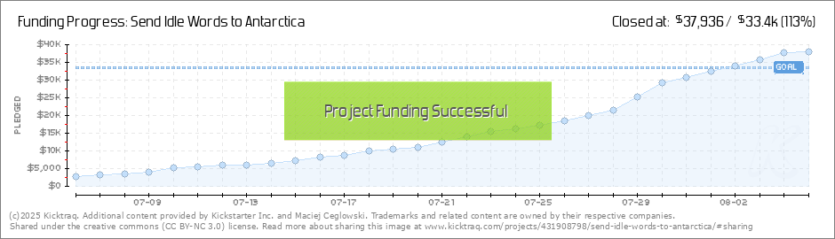 I am delighted to report that sometime around 2 AM on Sunday, a backer placed this project gingerly over thie finish line. At this point nearly 900 of you have supported this project. I thought a trip to Antarctica was exciting before; it turns... (Read More)