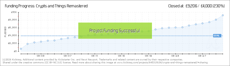 Glorious Backers and Curious Onlookers, We've done it! Crypts and Things Remastered is FUNDED :) In the coming days I let you know about the new stretch goals I have in mind, but for now there's the More Fiends goal at £4500. Maximum thanks to all... (Read More)