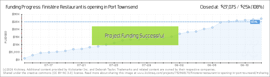 Hello all, We just hit 25% funded and that would not have happened without all of your support so far! We are so ready to get this restaurant up and running and bring all of the bounty of the Olympic Peninsula to you. While I am writing this, Scott... (Read More)