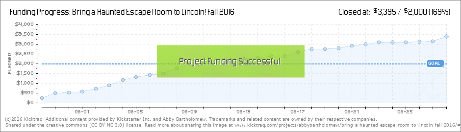Thanks to all of you, we hit our goal after only 12 days!! Lincoln has spoken—it definitely wants to see a haunted escape room! The campaign is still open for 11 more days for pre-purchasing tickets and items. After that, we will send out a... (Read More)