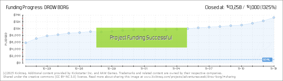 Art for DROW BORG by Jon X. GaraizarUPDATE #1 — FUNDED IN 10 MINUTES.You did this. DROW BORG was funded in the first 10 minutes, and less than a day later we’re closing in on $7,000. From myself and everyone at AAW Games: thank you. Your early... (Read More)