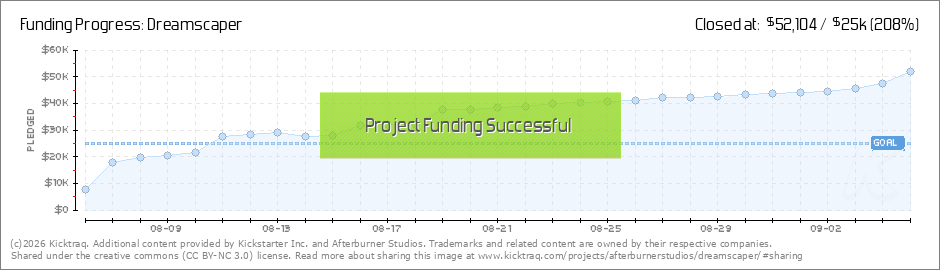 We are totally floored by the amazing support you all have shown for Dreamscaper. Thank you! This morning we broke 100% and are sitting at 109%, that's truly fantastic. We're well on our way to our first stretch goal at $30,000: a brand new boss... (Read More)