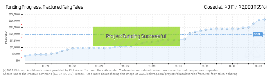 Looks like we met the target and that means' we're funded. The fairy tales are coming! To every single one of you who helped make this happen THANK YOU SO MUCH! I wil start working on the first reward - the three stories that are coming your way... (Read More)