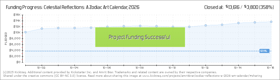 It’s all thanks to you! ✨ Celestial Reflections: A Zodiac Art Calendar was fully funded in just 30 minutes. Thank you to every one of you who backed, shared, and spread the word. Seeing this project come to life so quickly has been incredible. We... (Read More)