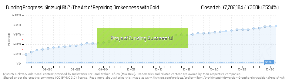 Dear all, Thank you so much for your amazing support! It is truly appreciated to have so many interested in our 2nd kintsugi kit project here on Kickstarter. In less than an hour you helped us reach our goal, and now not even being live for a day... (Read More)