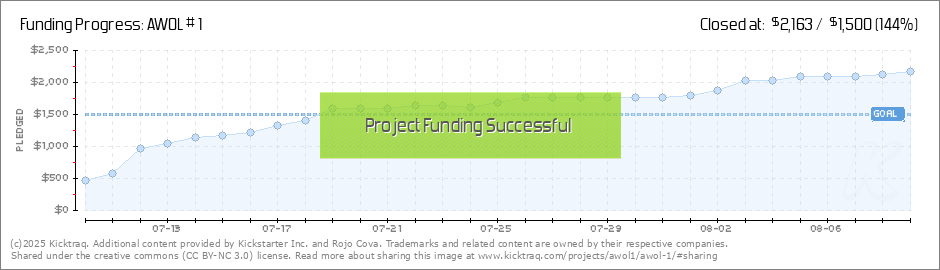 We hit our first stretch goal! The AWOL #1 Sticker Pack, and we still have 9 days left to get hit the second stretch goal which is the early copy of AWOL #2! Thank you for supporting this campaign. Lets finish this one out strong, best ways of... (Read More)