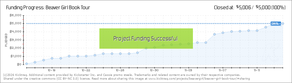 YAY! We did it! The Beaver Girl Book Tour is now fully funded! THANK YOU SO MUCH!!! I will be in touch with all the backers to send rewards, so if you're a backer, keep an eye out for that message. Much love and gratitude, Cassie (Read More)