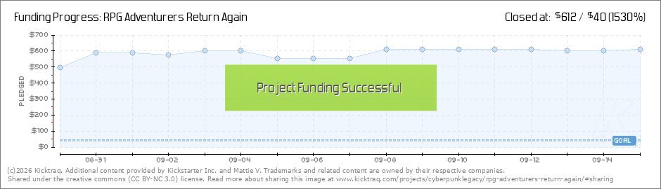 Help your backers reach your daily goals and help others see how you're doing. It's easy, with Kicktraq Mini.Here are a few quick snippits of code you can use to embed your personalized widget on your website, in your blog, and even on your favorite forum.