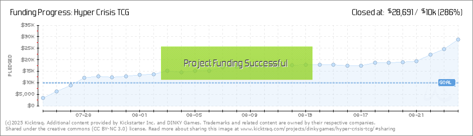 Hyper Crisis TCG is over 100% funded! We want to thank each and everyone who pledged to make these cards a reality. We hosted an initial giveaway to those who signed up before the release of the Kickstarter and we've received confirmation of all 5... (Read More)