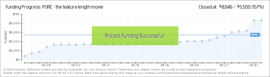 We are over the hump and now at 60% mark for our minimum goal. We are trying to reach our minimum goal of 5,500, our reach goal is 8,500. We have 60% but we still have a long way to go to make PURE: graphic novel in to a feature length movie. I... (Read More)