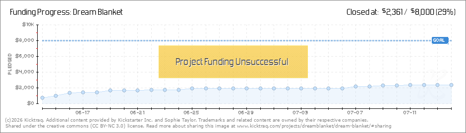 Dear Dream Blanket Backers and Friends, We're now in the final week of our Kickstarter campaign, with just six days to go! I'm in awe of the incredible support we've received so far. We have raised $2,141, which is truly amazing! Your belief in Dream... (Read More)