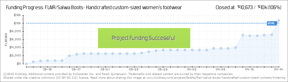 Dear my awesome backers, We just surpassed $2,000! Woohoo! Thanks to you now we are closer to reaching our goal! I am so happy to see the feedback I receive from some of you. One of the goals that I want to achieve is to make Salwa Boots become a... (Read More)