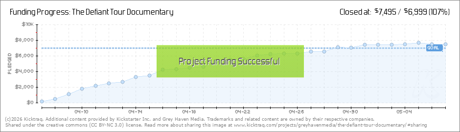 'The Defiant Tour Documentary' is 46% funded with 22 days left. Thank you for your contribution. With your support we can meet and even exceed our goal! https://www.kickstarter.com/projects/greyhavenmedia/the-defiant-tour-documentary (Read More)