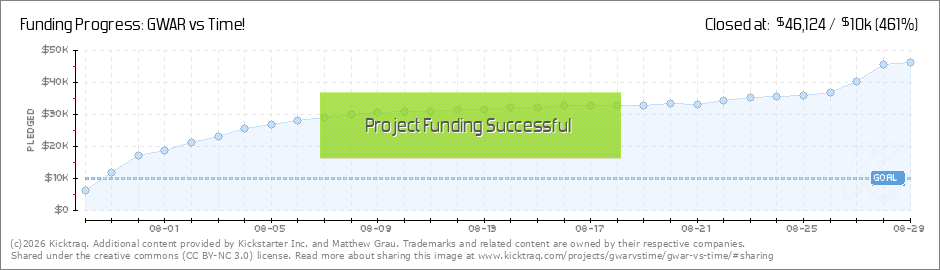 First Day - Thank you We want to thank everyone for helping to make GWAR vs Time first day a success. We have almost reached our initial funding goal. You can help us get there by spreading the news on social media about this project link with... (Read More)