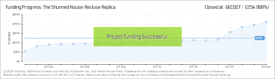 Hello backers, Thank you all so much for supporting the Recluse Replica edition of The Shunned House! As day one is drawing to a close, we are close to 45% funded, and feeling great about the campaign. It is gratifying to know that people are as... (Read More)