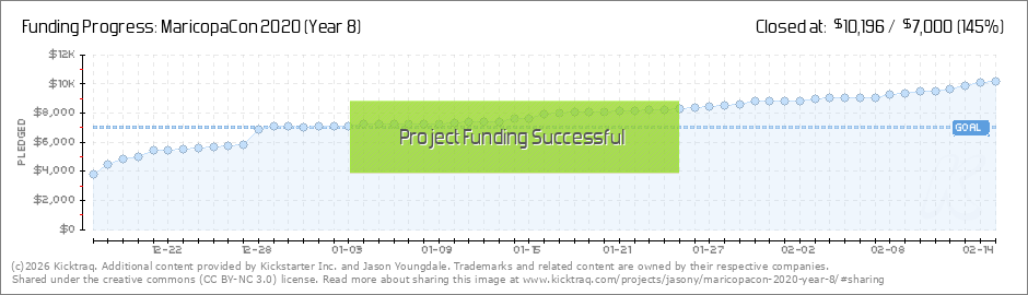 We just hit our funding goal! A huge thanks to everyone who are current backers! Without you, our MaricopaCon community, this annual adventure together would not be possible. We now have a sponsor, who we will reveal soon (after I've had a chance... (Read More)