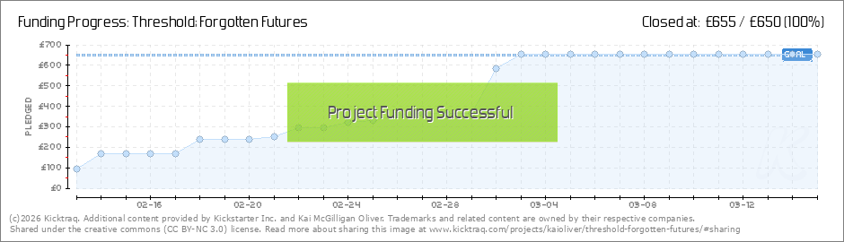 Hi everyone! Well done peeps! Threshold; Forgotten Futures has been successfully funded... I'm so blooming pumped for the next two weeks ahead! Thanks to you the project has piqued the interest of other festival events, so there is the potential for... (Read More)