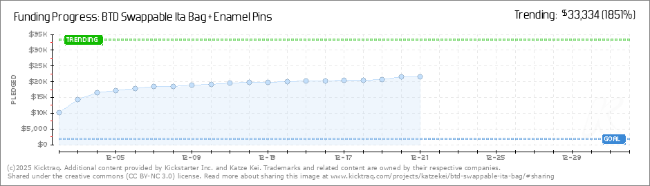 Hallo Lieblings!!! Today has been nothing less than insane. We funded the bag in ONLY 15 minutes, and the pins in 25!! We're now past the initial stretch goals by over DOUBLE. Y'ALL ARE CRAZY AND I LOVE YOU. I'll be posting another update... (Read More)