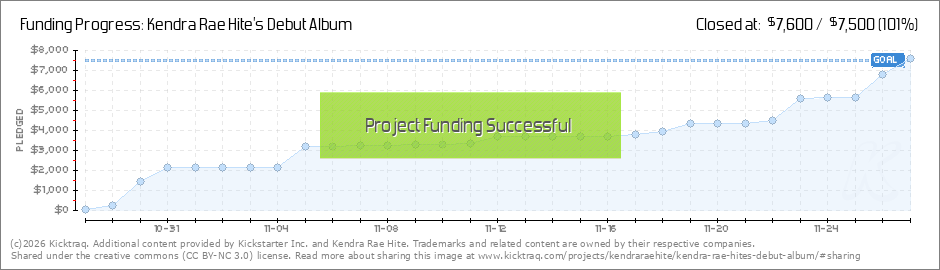 Dear friends and family, I wouldn't want anyone to feel like they missed the boat if you've considered this Kickstarter project to finish my debut album. So this is it!! With just over 24 hours left in the campaign, it is 75% funded so just $1885... (Read More)