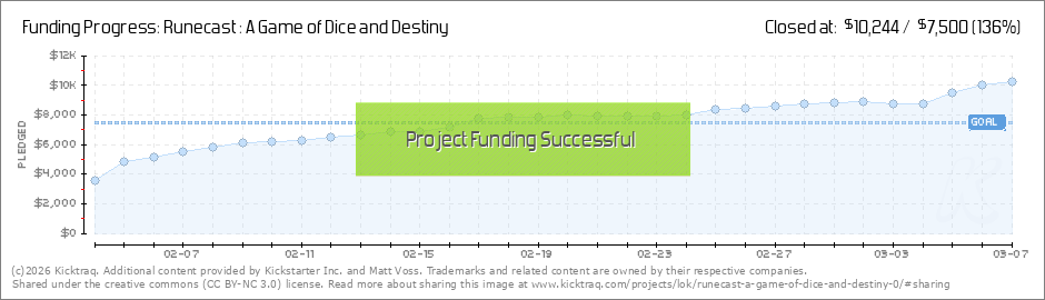Our first stretch goal was met thanks to Backer No_Way301! Thanks for being awesome! We are now going to start closing in on our next stretch goal for exclusive Runecast Dice bags! Did you know if everyone raised their pledge by $5 we'd be... (Read More)