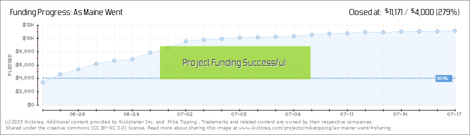 There are just 10 hours left in the Kickstarter and we're at $11,096. Wouldn't it be cool if we hit $12,000, triple the original goal? www.AsMaineWent.com -Mike (Read More)