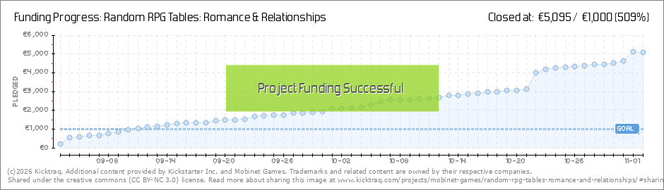 Hi everyone! We’ve just unlocked the very first stretch goal: two brand-new romance tables will now be added to the book! Thank you all so much for your support! We’re also officially at the halfway point of the campaign with 30 days still to go.... (Read More)