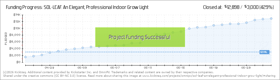 We are thrilled to announce that our Sol-Leaf Kickstarter campaign has been fully funded! Within just 5 days, we met our target goal of $3,000 and surpassed it and we’re now standing at just over $3,700. We could not have done it without you, and... (Read More)