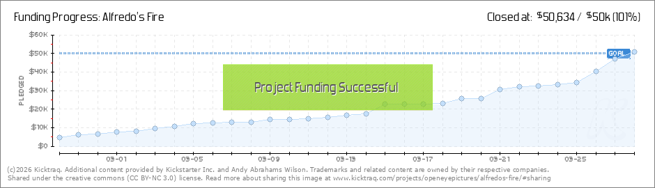 Hello Beautiful Backers & Potential Supporters, We're very happy to report that, with the exceptional generosity of a $5,000 donor, ALFREDO'S FIRE has now been pushed ahead to over $22,000, which means we're almost half-way to the finish line!... (Read More)
