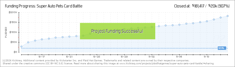 Super Auto Pets Card Battle has funded! Our sincere thanks to everyone who backed, making this dream a reality! Without you, this game wouldn't exist! We'd also like to thank our partners at Team Wood Games for letting us make a physical adaptation... (Read More)