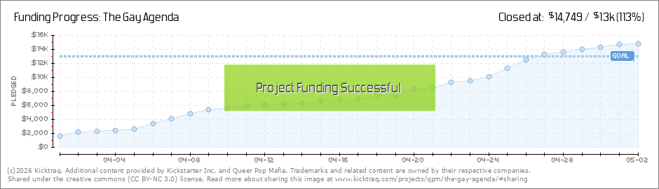Thank you supporters of The Gay Agenda project! Our Last backer just brought us over the $4000. mark, 53 backers, and 30% of the way to our goal in our first week. Thanks to you!!! (Read More)