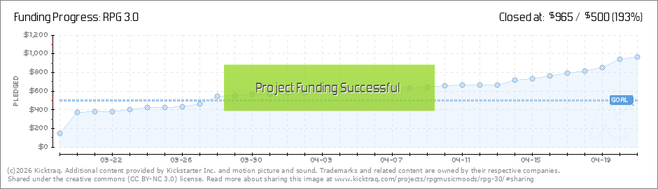 Hi Backers, Thank you for helping us reach our funding goal. We're less than 40 backers away from reaching our 1st stretch goal. Our hope is to deliver to you as many RPG Music Moods tracks as possible. Please share this project with your... (Read More)