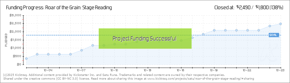 Well that's exciting! We made our minimum goal. What a lovely sight! THANK YOU TO OUR WONDERFUL BACKERS - now we'll be able to cover all the costs of our upcoming stage reading, happening at the Art of Acting Studio in Hollywood this Thursday,... (Read More)
